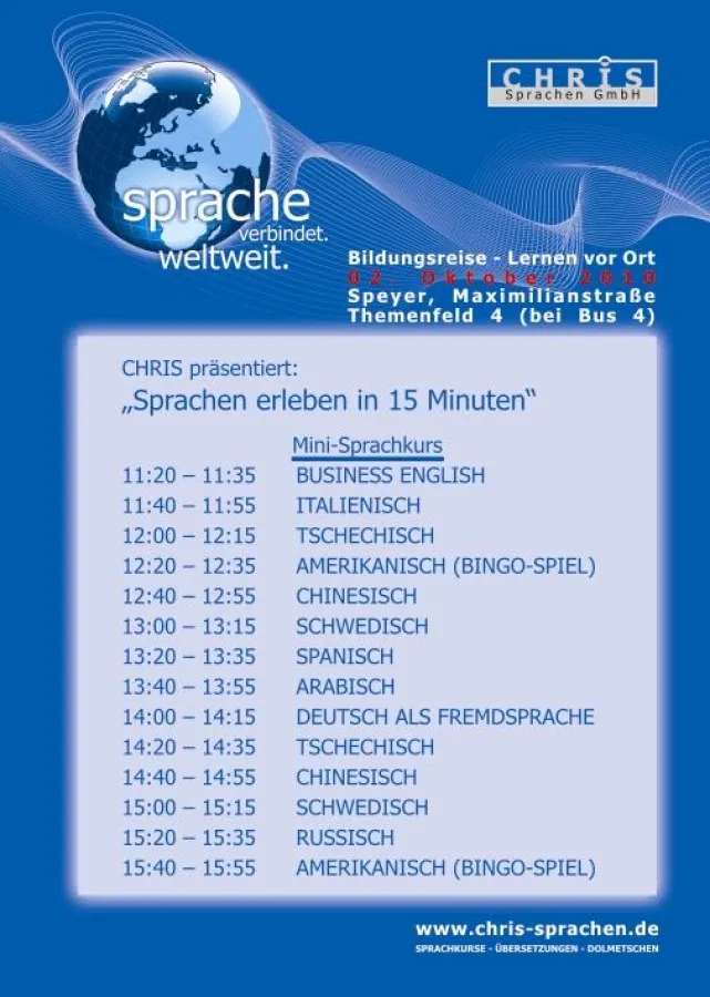 (openPR) Die Sprachenspezialisten der CHRIS Sprachen GmbH unterstützen die Speyerer „Bildungsreise“ auf der Maximilianstraße am 02. Oktober 2010 mit kostenlosen Mini-Sprachkursen in: Arabisch, Amerikanisch, Chinesisch, Deutsch als Fremdsprache, Business English, Italienisch, Russisch, Schwedisch, Spanisch und Tschechisch. Die Kurse ermöglichen in 15 Minuten einen unterhaltsamen Einblick in fremde Sprachen und Kulturen unter dem Motto „Sprachen erleben“. Eine Anmeldung ist nicht erforderlich. Die Zeiten der einzelnen Kurse sind auf der Homepage veröffentlicht. Den Programm-Flyer sowie weitere Informationen erhalten Sie bei der CHRIS Sprachen GmbH, Fischergasse 31, 67346 Speyer telefonisch unter 06232/64250 oder per E-Mail ![]()
