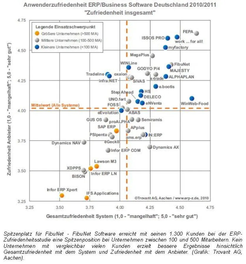 Die mittelständischen Unternehmen zwischen 100 bis 500 Mitarbeitern gaben FibuNet in allen Rubriken weit überdurchschnittliche Werte. Kein Softwareunternehmen mit vergleichbar vielen Installationen hat laut der Studie zufriedenere Kunden. FibuNet nahm erstmals an der Befragung teil und erzielte aus dem Stand eine absolute Spitzenposition. Keinem Wettbewerber von FibuNet ist es gelungen, in allen bisher durchgeführten Trovarit-Studien bessere Ergebnisse zu erzielen.