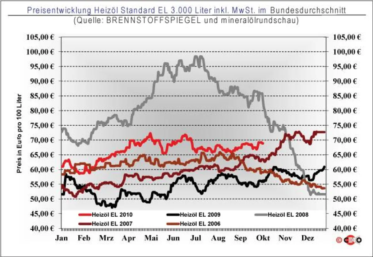 Die Entwicklung der einheimischen Heizöl-Endverbraucherpreise im Bundesdurchschnitt und in den einzelnen Bundesländern zeigen die Grafiken auf dem Energieportal www.brennstoffspiegel.de in der Rubrik Marktdaten. Regionale Abweichungen sind marktbedingt jederzeit möglich.