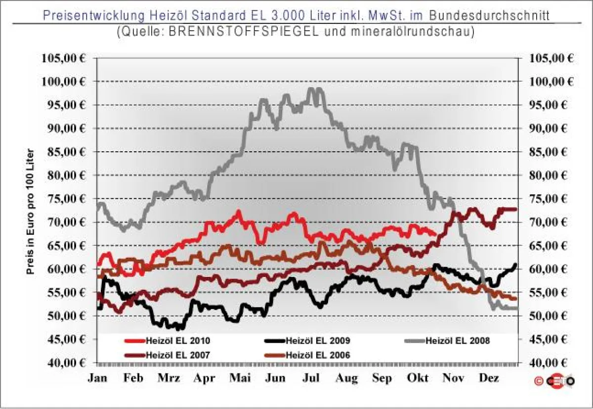 Außer 2008, als sich die Rohölpreise im Sommer auf einem Allzeithoch befanden und mit ihnen die Heizölnotierungen bis zum Jahresende um rund 24 Euro absanken, stiegen die Preise bis zum Ausklingen der Heizperiode im folgenden März/April immer kontinuierlich an – 2007 um rund 13 Euro und 2009 um 4 Euro. Da die bisherigen Verläufe von 2010 noch am ehesten mit diesen beiden Jahren zu vergleichen sind, ist auch derzeit mit einem Ansteigen zu rechnen. Heizölverbraucher sollten sich also jetzt eindecken und nicht auf fallende Preise hoffen. Das berichtet das Onlineportal des Fachmagazins BRENNSTOFFSPIEGEL und mineralölrundschau auf seiner Website www.brennstoffspiegel.de.