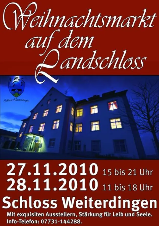 Auf Schloss Weiterdingen, wo sonst romantische Märchenhochzeiten oder spannende Vorträge und Firmenevents stattfinden, wird es am ersten Adventwochenende wieder weihnachtlich bunt und geschmackvoll. Am Samstag, den 27. November von 15 bis 21 Uhr und am Sonntag, den 28. November von 11 bis 18 Uhr präsentieren die erlesenen Aussteller Ihre hochwertigen Waren und auch für das leibliche Wohl wird wieder bestens gesorgt sein.