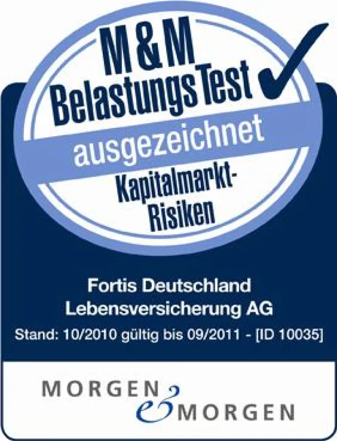 Morgen & Morgen untersucht bei ihrem Belastungstest anhand von Bilanzkennziffern, wie souverän Lebensversicherungsunternehmen eine weitere Kapitalmarktkrise mit 20 Prozent Aktienverlust und zwei Prozent Zinsrückgang meistern. Ist die Kapitalausstattung so hervorragend wie bei Fortis Deutschland, winkt die höchste Bewertung "ausgezeichnet".