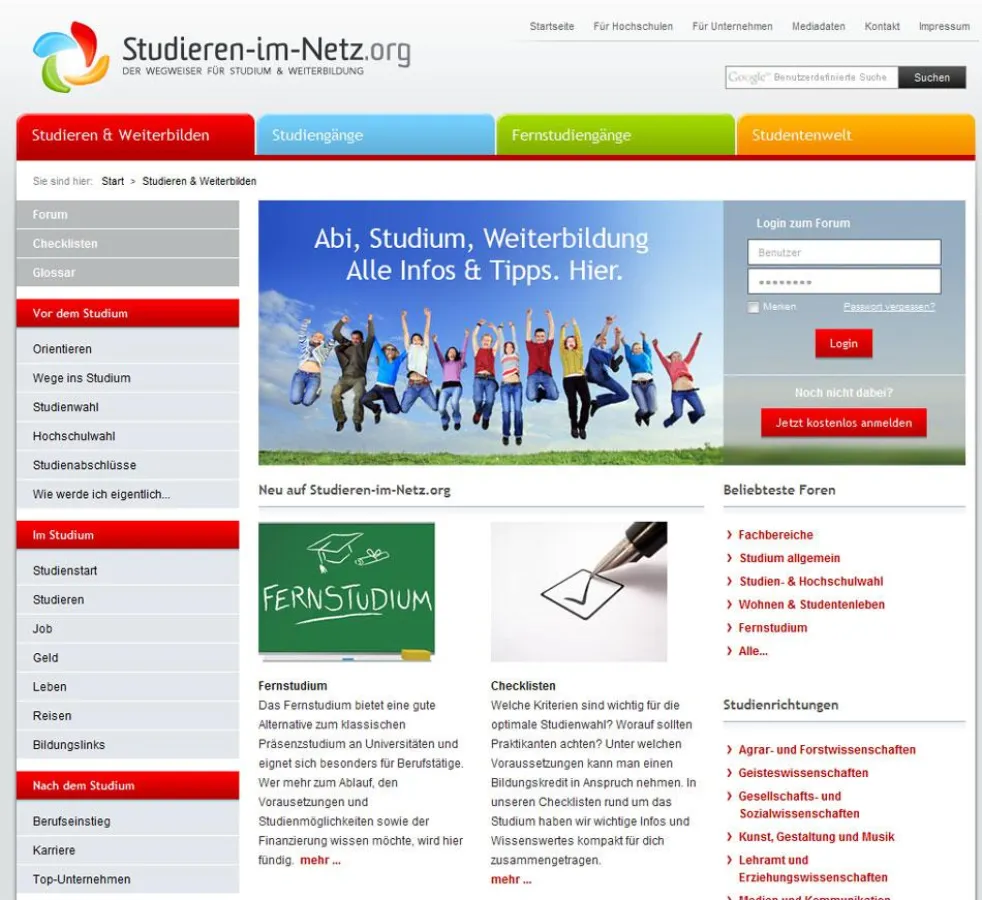 Seit dem Relaunch am 22.01.2010 erscheint das Portal nun im neuen, frischen Design und mit zusätzlichen Angeboten. Neben über 400 redaktionellen Artikeln bilden die Studiengangdatenbank mit über 14.000 Studiengängen sowie Profile von rund 300 verschiedenen Fernlehrgängen das Herzstück des Portals.