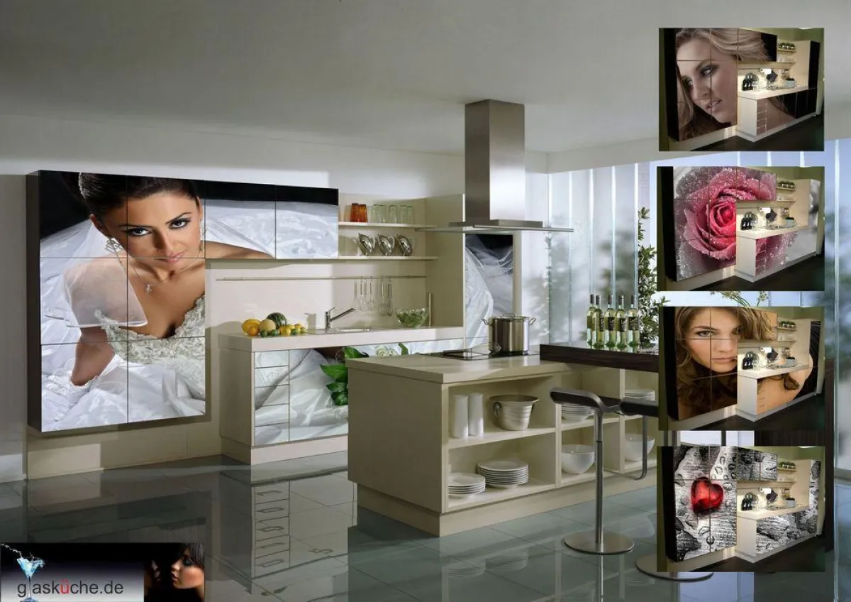 Die aktuelle "Jill Daimel" Collection ist die grifflose Glasküche, diese Küchenvariante unterscheidet sich von den herkömmlichen Küchen, in Ihrer Küchenfront. Hierbei kann der Kunde seine ganz individuelle und exclusive Küchenfront selbst gestalten, in dem er Fotos aus seinem Leben oder ein Kunstwerk als Küchenfront haben möchte. Hierbei ist möglich das Foto oder das gescannte Kunstwerk hinter Sicherheitsglas zu bekleben oder zu bedrucken. Dies ist auch für Glas-Arbeitsplatten möglich. Durch die glatte Oberfläche der grifflosen Glasfront ist die Reinigung und Pflege einfach zu handhaben. Das Austauschen der Glasfronten ist möglich, da hier die Blum-Technik eingesetzt wird. Die Glasfronten können auch an kleineren Küchen angebracht werden. Perfekte Verschmelzung zwischen Küchen- und Wohnraumgestaltung. Dass aus hochmodernen Küchenmöbeln interessante Kombinationen entstehen können, bis hin zu ansprechenden Wohnkonzepten, wird einmal mehr durch diese interessante Zusammenstellung verdeutlicht.
