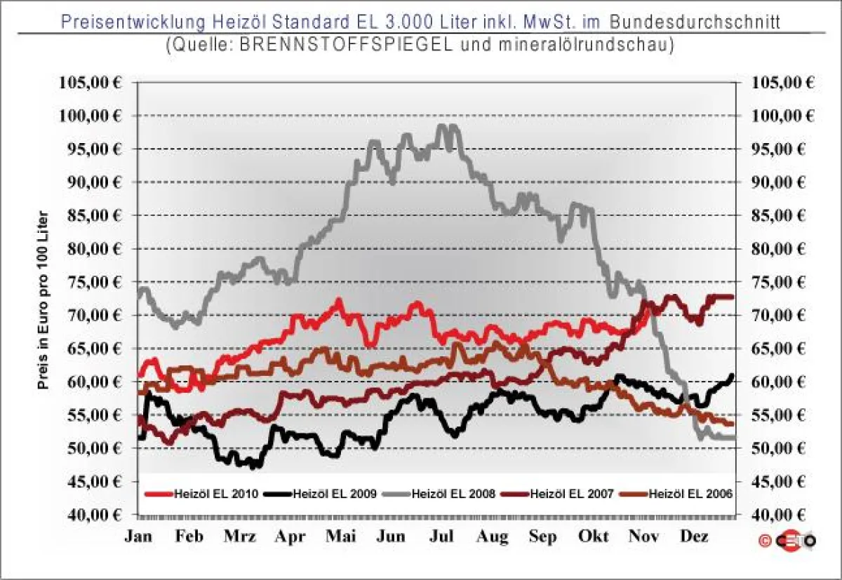 Die Entwicklung der einheimischen Heizöl-Endverbraucherpreise im Bundesdurchschnitt und in den einzelnen Bundesländern zeigen die Grafiken auf dem Energieportal www.brennstoffspiegel.de in der Rubrik Marktdaten. Regionale Abweichungen sind marktbedingt jederzeit möglich.