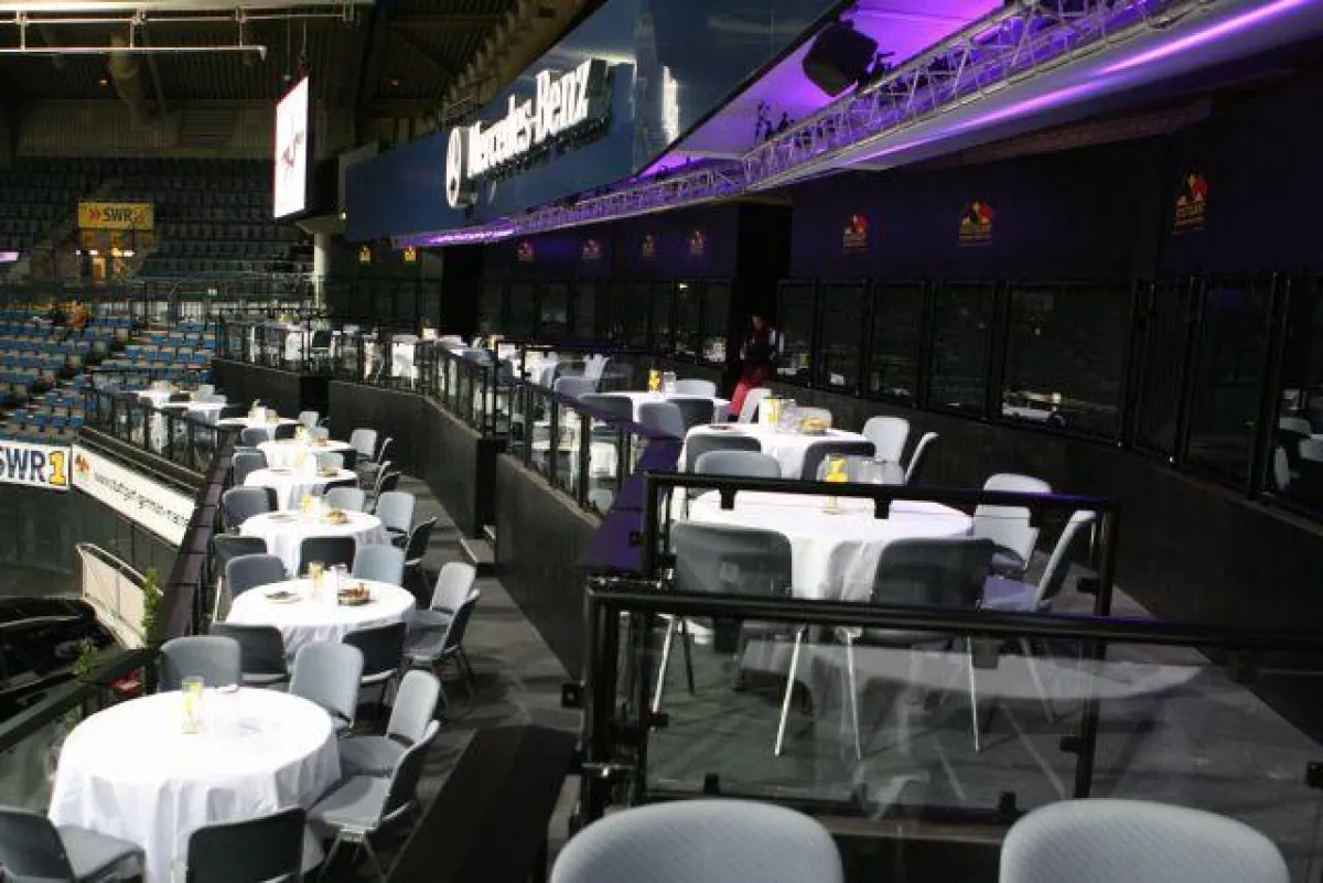 Die Hanns-Martin-Schleyer-Halle beauftragte die GEMCO Veranstaltungsmedien GmbH mit dem Bühnenbau der VIP-Lounge. Hierfür wurde ein Teil der sonst fest eingebauten Tribüne mit Sonderpodesten der Firma Schnakenberg überbaut. Drei Ebenen mit insgesamt ca. 250 m² Fläche standen somit den VIP-Gästen während den GERMAN MASTERS zur Verfügung. Damit die Gäste freie Sicht auf das Turnier bekamen, wurden hierfür spezielle Geländer mit Glaseinlage angefertigt. Für die Bewirtung wurde hinter der Tribüne ein Cateringbereich eingerichtet und mit passenden Stellwänden als Sichtschutz abgetrennt.