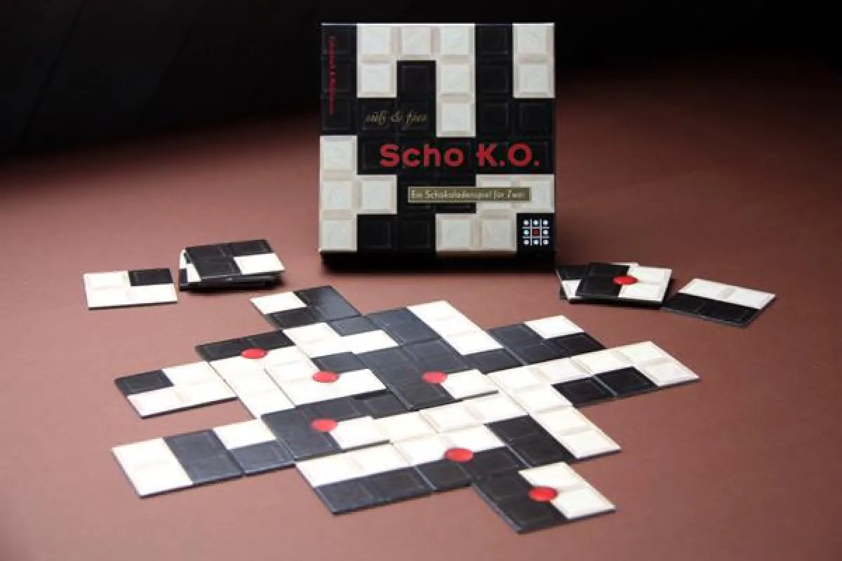 Das doppeldeutige Schokoladenspiel „Scho K. O.“ von Andreas Kuhnekath und Steffen Mühlhäuser lässt zwei Spieler gegeneinander antreten. Liebevoll gestaltete „Schokoladenplättchen“ müssen zu einer möglichst großen Tafel zusammengelegt werden. Dabei kann es auch einmal drunter und drüber gehen. Ein ästhetischer Spielgenuss ab acht Jahren.