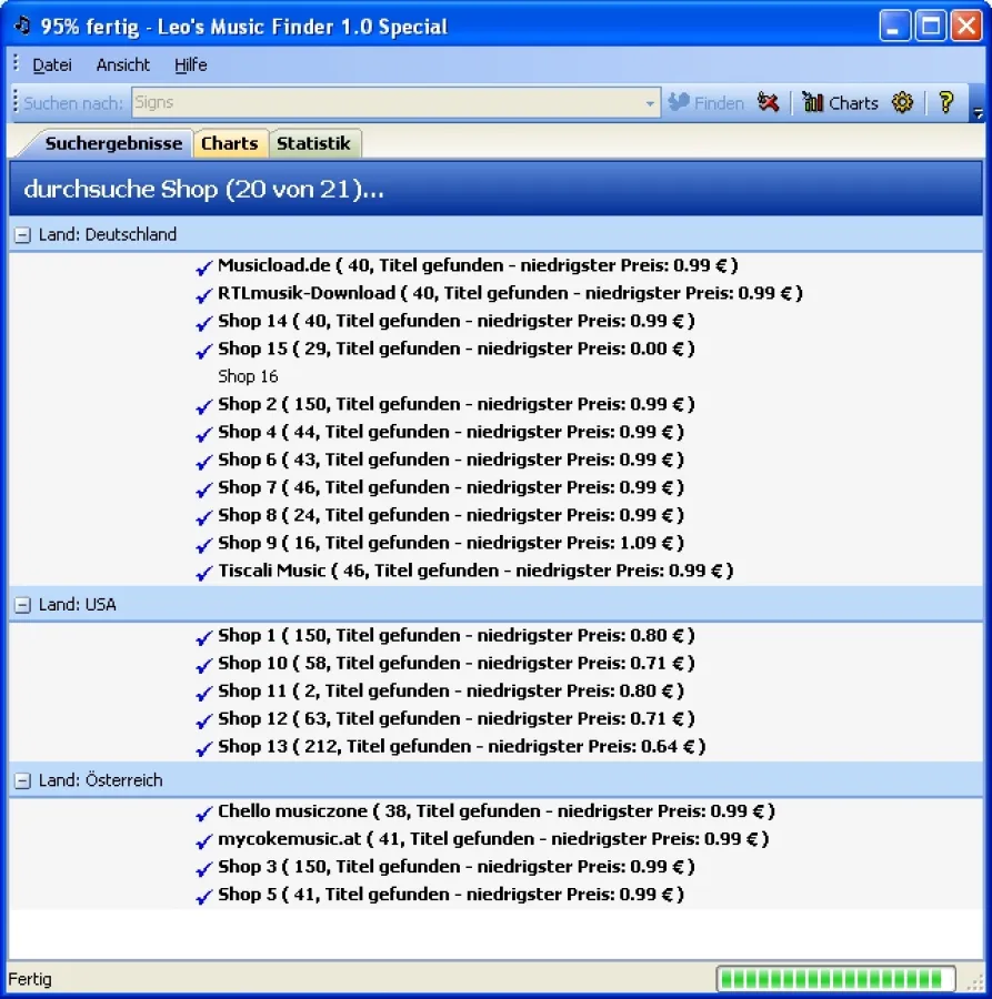 Natürlich dauert es sehr lange, mehrere Download-Portale nacheinander selbst zu besuchen, um hier manuell die Preise der gesuchten Songs zu vergleichen - wenn dem Musikfreund die Web-Adressen überhaupt bekannt sind. Um das Prozedere abzukürzen, bietet das MedienTeam66 seinen "Leo’s MusicFinder" an. Das Tool konzentriert sich auf die 20 wichtigsten Download-Portale in Deutschland und kennt dabei ein Angebot von über drei Millionen herunterladbaren Musiktiteln.