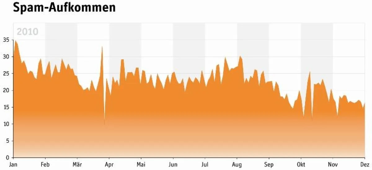 1. Das durchschnittliche Spam-Aufkommen ging 2010 um 31 Prozent zurück. Damit liegt es derzeit auf dem Niveau von Anfang 2009. Wuchs das Spam-Volumen im Juni und Juli noch um 10 Prozent, ging es im November 2010 um 14,6 Prozent zurück. Der Rückgang ist möglicherweise eine Folge zahlreicher Botnet- Abschaltungen. Im Frühjahr traf es Waledac und Mariposa, im Herbst Bredolab, der Spam-Dienst Spamit.com wurde zum 1. Oktober 2010 eingestellt. Während sie im Jahresschnitt zum Rückgang des Spam-Aufkommens beitrugen, waren ihre Auswirkungen deutlich geringer als die Abschaltung des Spam-Hosters McColo im Herbst 2008, als das Spam-Aufkommen innerhalb kürzester Zeit um mehr als 60 Prozent einbrach. Dies zeigt, dass die heutigen Botnets deutlich ausfallsicherer aufgebaut sind.