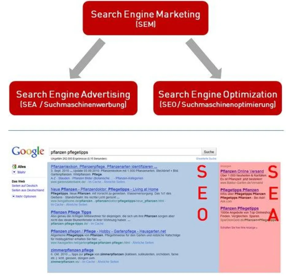 Zugegeben, auf den ersten Blick hört sich das Ganze fast gleich an. Allerdings sind SEA, SEO und SEM lediglich Abkürzungen aus dem speziellen Bereich des Internet Marketing, bei dem es ausschließlich um Suchmaschinen wie Google, Yahoo und Co. geht. SEM bedeutet Search Engine Marketing bzw. Suchmaschinenmarketing und bildet eine Art Oberdisziplin, welche sich aus den Feldern SEO und SEA zusammensetzt. SEO steht dabei für Search Engine Optimization bzw. Suchmaschinenoptimierung und betrifft die neutralen Ergebnisse, währen es sich bei SEA - Search Engine Advertising- um bezahlte Werbung auf den Suchergebnisseiten der Suchmaschinen handelt. Die oben stehende Abbildung verdeutlicht dies.