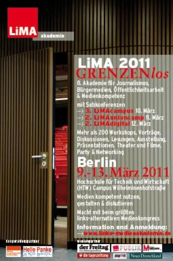 Veranstaltet wird die LiMA 2011 von Linke Medienakademie e.V. in Kooperation mit Helle Panke e.V. – Rosa-Luxemburg-Stiftung Berlin. Linke Medienakademie e.V. organisiert als gemeinnütziger Bildungsträger Weiterbildungen für Medienmacher und –interessierte unter dem Leitsatz „Medien kompetent nutzen, gestalten & diskutieren“. Medienpartner der LiMA 2011 sind u.a. der Freitag, die tageszeitung, Neues Deutschland, junge welt, ver.di PUBLIK, M – Menschen Machen Medien, Druck + Papier.