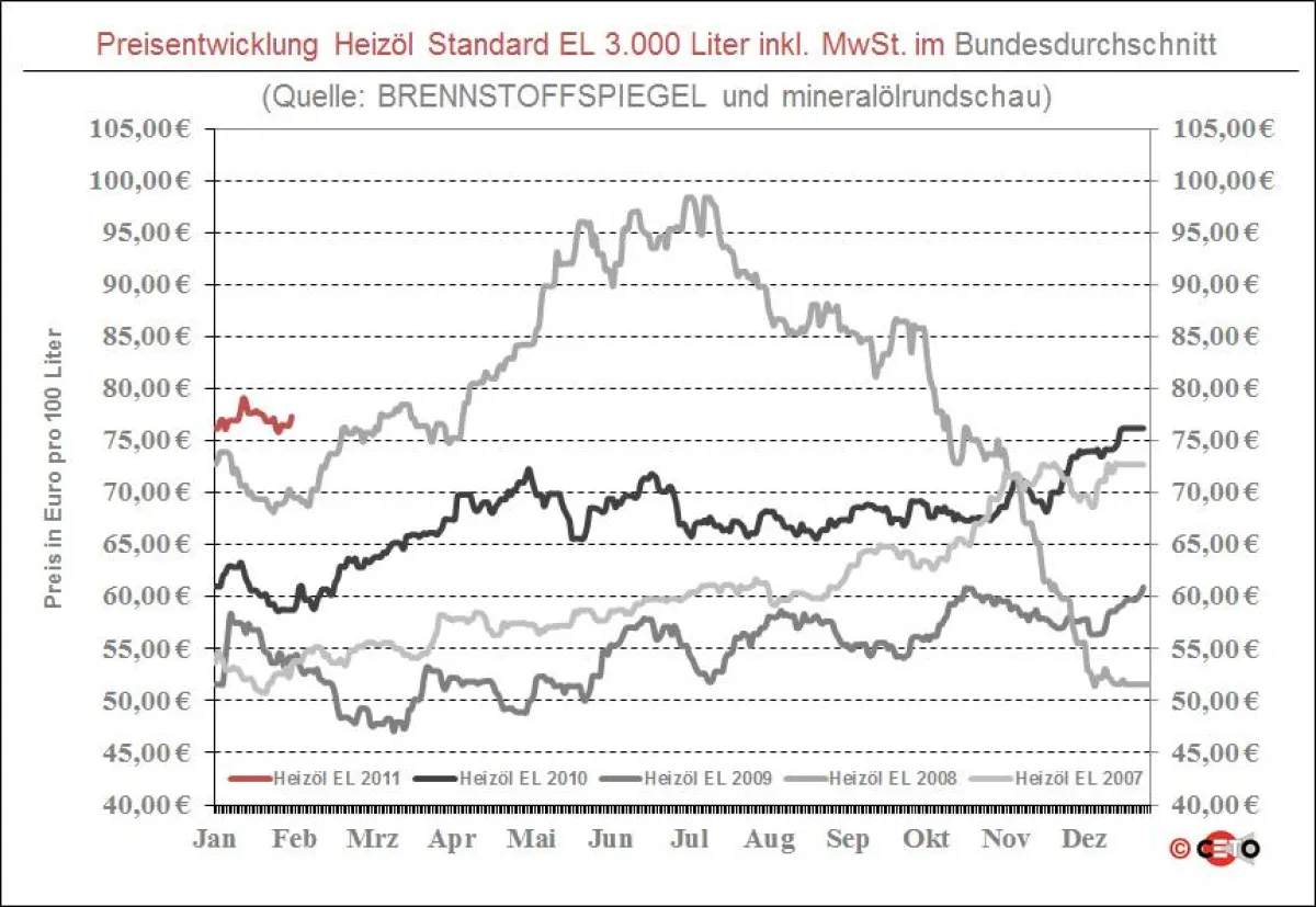 Der steile Anstieg der Rohölnotierungen am Freitag schlägt sich heute indes auf den hiesigen Heizölmarkt durch. Demnach gab der Handel Aufschläge in Höhe von 86 Cent pro 100 Liter weiter, der Partie-Preis liegt nun bei 77,31 Euro. Dieser von BRENNSTOFFSPIEGEL und mineralölrundschau erhobene Wert spiegelt den Bundesdurchschnitt wider. Damit ist Heizöl weiter teurer als im gesamten Vorjahr – in 2010 war für die 100-Liter-Partie Heizöl EL (bei einer Gesamtmenge von 3.000 Litern) nie mehr als 76,18 Euro zu zahlen.