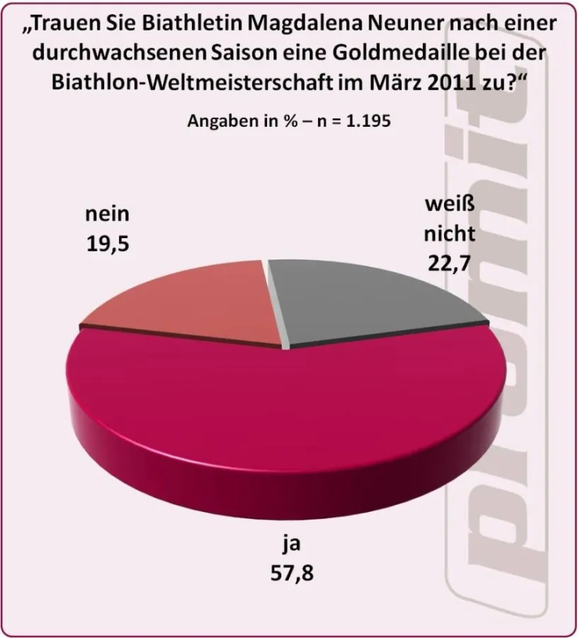 Nachdem sie bisher zweimal die Saison als beste Athletin mit dem Sieg des Gesamtweltcups abschließen konnte, setzt nun nicht nur Neuner auf eine Rettung der aktuellen Saison bei der anstehenden Weltmeisterschaft. Auch die Hoffnungen der deutschen Bevölkerung ruhen auf der 24-jährigen: So geben 57,8% der im Rahmen des SportMonitors Befragten an, dass sie Magdalena Neuner eine Goldmedaille zutrauen. Lediglich knapp ein Fünftel (19,5%) glaubt nicht an die nach WM-Goldmedaillen dritterfolgreichste deutsche Biathletin. 22,7% der Interviewten haben sich zu den Erfolgsaussichten keine Meinung gebildet.