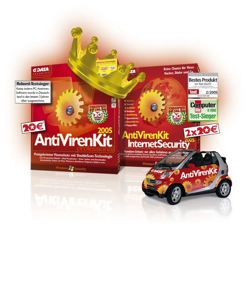 Bochum, 23. Juni 2005 – G DATA wird 20 Jahre jung und alle feiern mit. Mit einem Feuerwerk an Jubiläumsaktionen vom 27. Juni bis Ende August sagt das Bochumer Softwarehaus „Danke schön“ an Handelspartner, Geschäftsfreunde und Kunden. Breit angelegte Marketingkampagnen, Topseller zu Geburtstagspreisen und als Höhepunkt die Verlosung eines nagelneuen Smart Cabriolets im AntiVirenKit-Design sind die Eckpfeiler des geschnürten Jubiläumspakets.