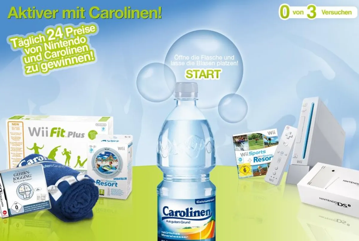 Mit dem Gewinncode von der Aktionsflasche wird das von brandung inszenierte Flash-Game sofort gestartet, Gewinner der über 1.200 Sachpreise werden unmittelbar nach der Spielrunde über ihr Glück informiert. Alternativ können Teilnehmer einen Gewinncode per E-Mail anfordern. Pro Aktionscode haben Internetnutzer drei Versuche, eine Sprudelblase mit Sofortgewinn anzuklicken. Als Hauptpreis winkt unter anderem 36 Mal die Nintendo Wii, die Spielekonsole die Lust auf Bewegung macht.