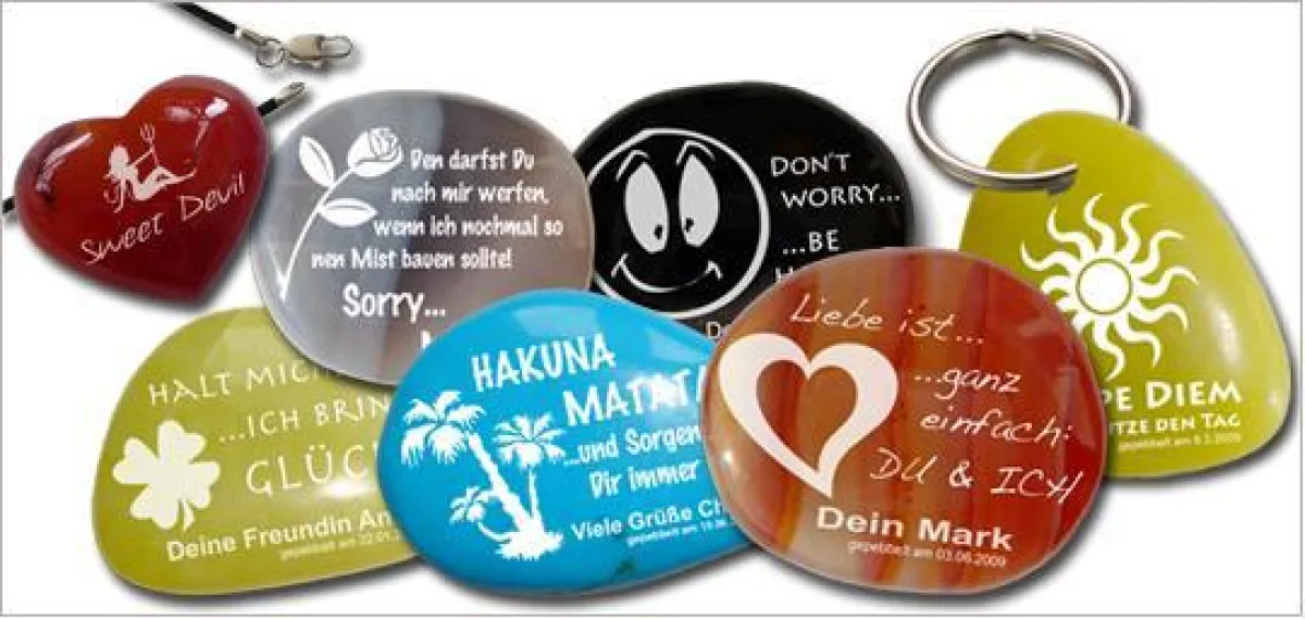Ein Internetportal mit dem lustigen Namen „my-Pebbles“ (www.my-pebbles.com) hat es sich zur Aufgabe gemacht, die Schmucksteine mit personalisierten Grußbotschaften zum Kauf anzubieten. Die Idee ist altbewährt: Schon der Zeichentrick-Vorzeige-Ehemann Fred Feuerstein hat in einer Folge seiner Ehefrau Wilma seinen Liebesschwur in Stein gemeißelt und ihr Herz damit zum Schmelzen gebracht. Etwas moderner, aber mit der gleichen Aussagekraft bringen auch die my-pebbles-Edelsteine Augen zum Leuchten und Herzen zum Glühen.