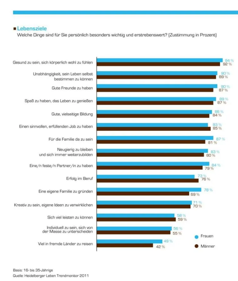 „Der Wunsch nach Freiheit, Freude am Leben und Persönlichkeitsentfaltung ist Ausdruck neuer Wertepräferenzen und Selbstverwirklichungsansprüchen. Die Ergebnisse zeigen aber auch, dass klassische Lebensziele wie Familie und Freunde nichts von ihrer Bedeutung verloren haben“, so Andreas Steinle, Geschäftsführer des Zukunftsinstituts.
