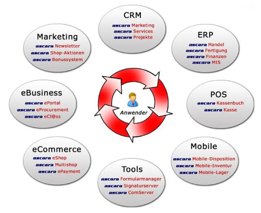 Der Einsatz der ascara Business Solution soll die Anwendung so transparent und strukturiert wie möglich gestalten, um an richtiger Stelle Zeit und damit Kosten einsparen zu können. Steht erst einmal das Grundgerüst als Basis, kann jede Erweiterung angepasst an die Erfordernisse der Anwender nahtlos eingefügt werden. Der modulare Aufbau erlaubt die freie Gestaltung der kompletten Software-Landschaft unter einer einheitlichen und intuitiven Benutzeroberfäche für alle Anwendungen. Abgedeckt werden können sämtliche Geschäftsbereiche bis zum Online-Shop. Komfortables Arbeiten durch automatisierte Prozesse gehören, insbesondere bei hohem Auftragsaufkommen, ebenso zum Standard, wie die Einbindung zahlreicher Schnittstellen, wie beispielsweise DATEV, UPS oder DHL, die Bereitstellung von Online-Bestellsystemen (SPICERS, ALKA, BÜRORING etc.) oder die Anbindung an Preissuchmaschinen, Zahlungssystemen usw. Ebenfalls integriert sind der XML-basierte Standard BMEcat für den Austausch von Produktkatalogen sowie das Klassifizierungssystem eCl@ss für Gruppierung von Materialien, Produkten und Dienstleistungen.