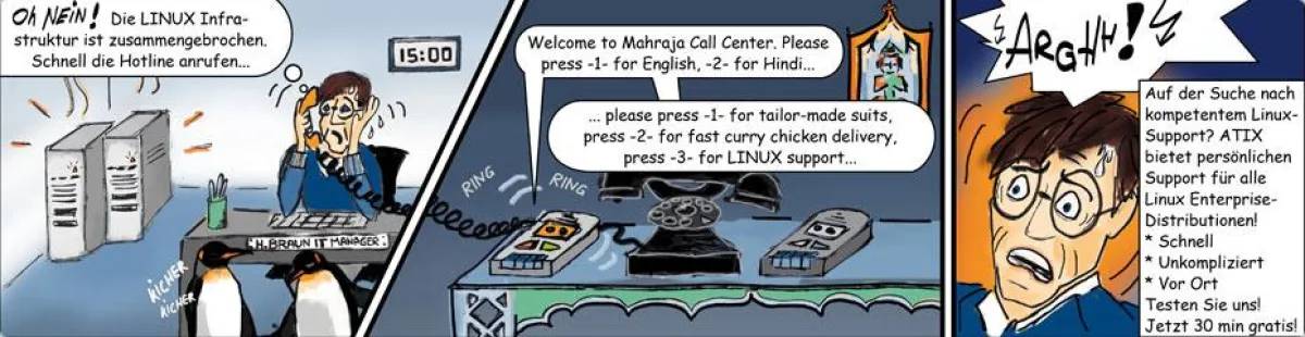 ATIX offeriert schnellen Support. Schneller Support ist das A und O. Denn wenn im schlimmsten Fall ein Systemausfall droht, muss schnell gehandelt werden. Da bleibt keinen Zeit um in endlos scheinenden Warteschleifen bei nervtötender Begleitmusik im wahrsten Sinne des Wortes „zu hängen“ und etliche Fragen mit Hilfe von Zahleneingabe zu beantworten.