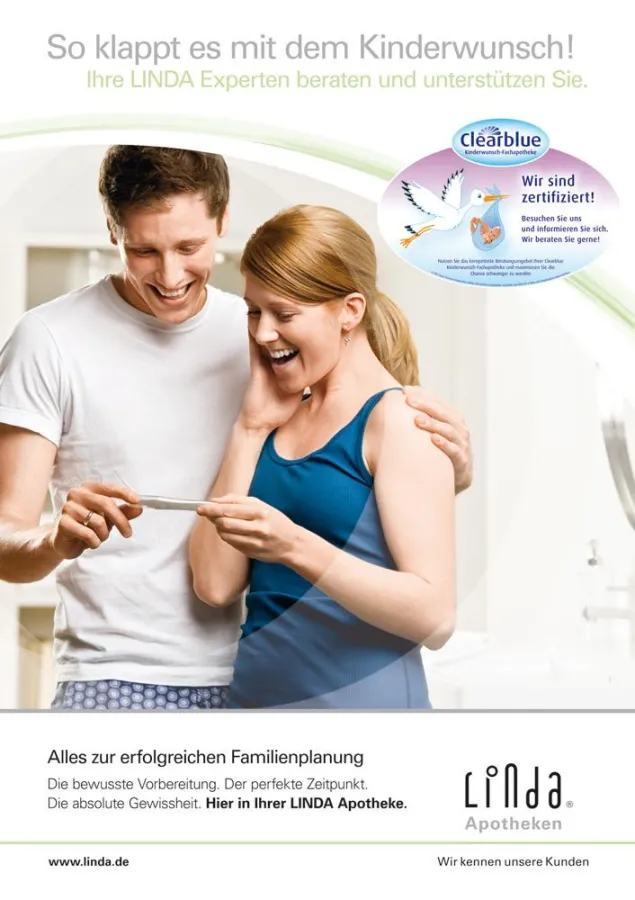 Die lokalen Verkaufs- und Beratungsaktivitäten der LINDA Apotheken starten parallel zur Ausstrahlung eines TV-Spots vom 6. bis 26. Mai 2011. Reichweitenstarke private TV-Sender werden für eine große Nachfrage nach den Clearblue Produkten Ovulationstest, Fertilitätsmonitor und Schwangerschaftstest sowie der umfassenden Beratung in den LINDA Apotheken sorgen.