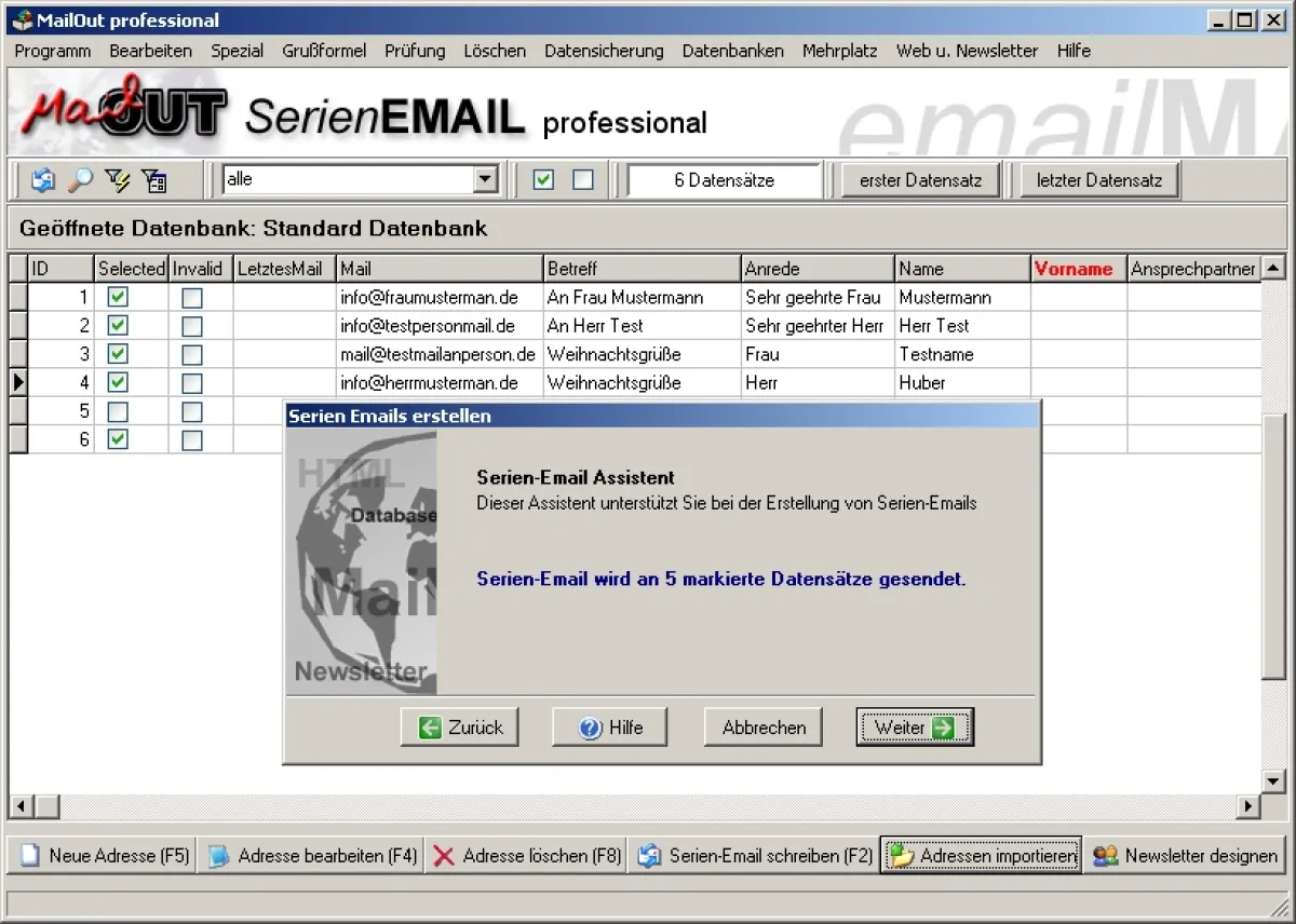 Das Programm verfügt zu diesem Zweck über eine eigene interne Datenbank. Die speichert nicht nur die E-Mail-Adressen der Adressaten, sondern merkt sich auch andere Informationen, so etwa den Namen einer Person, eine Anrede oder eine Adresse. Arbeitet der Benutzer beim Aufsetzen der Serien-Mails mit Platzhaltern, so übernimmt "MailOut Professional" die einzelnen Daten vollautomatisch in die ausgehenden E-Mails. Die Mails werden so personalisiert. Entwickler Roger Fritz: "Jeder Mail-Empfänger bekommt auf diese Weise das Gefühl vermittelt, persönlich angeschrieben zu werden. Das ist gegenüber den vielen seelenlosen Massen-Mails, die ansonsten im Internet kursieren und leicht als Spam gelöscht werden, ein ganz großer psychologischer Vorteil. Persönlich adressierte Schreiben werden von den Empfängern noch ernst genommen und tatsächlich gelesen." "MailOut Professional" kann eine E-Mail-Datenbank in Eigenregie anlegen, ist aber auch dazu in der Lage, Daten aus einer bereits vorhandenen Datenbank zu importieren und zu verwenden. Dabei kommt die Software mit dem Windows-Adressbuch, mit dem Outlook Express Adressbuch und mit Datenbanken in den Formaten Excel, Access, dBase, Paradox und FoxPro zurecht.