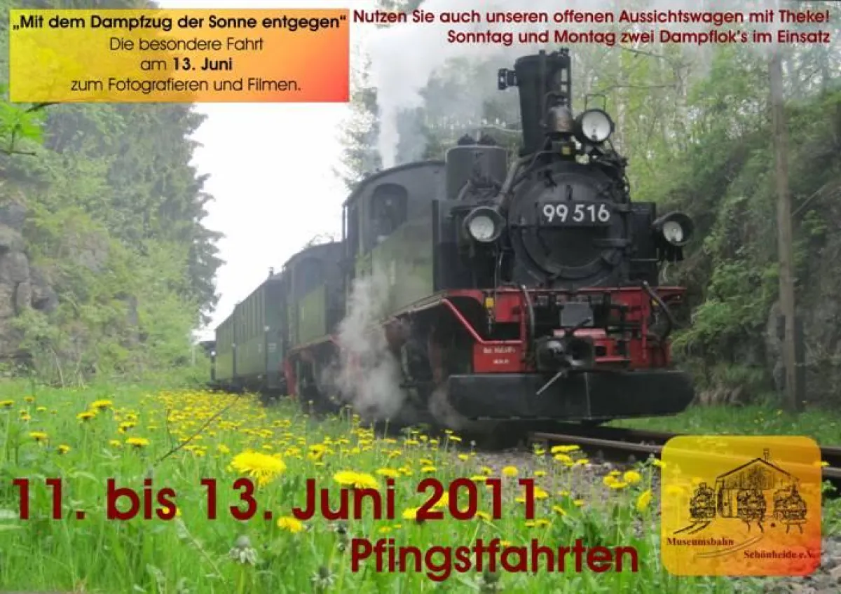 Zu ihren Pfingstfahrten vom 11. bis 13. Juni lädt die Museumsbahn Schönheide in das Westerzgebirge ein. Während am Samstag regulärer Fahrbetrieb mit einer Dampflok stattfindet, wird am Sonntag und Montag zusätzlich eine zweite Lok angeheizt. Beide sächsische IV-K’s wechseln sich bei der Zugbespannung ab. Für alle Foto- und Videofans dampfen dann zum Mittag (11.00 Uhr ab Schönheide) und am Abend (17.00 Uhr ab Schönheide) beide Loks gemeinsam vor dem Zug. Zusätzlich zu den fahrplanmäßigen Zügen verkehrt am Montag ein weiteres Zugpaar. Um 8.30 Uhr fährt ein Frühzug von Schönheide nach Stützengrün-Neulehn zum Waldgottesdienst. Die Rückfahrt erfolgt 9.00 Uhr ab Stützengrün als besondere Fahrt zum Fotografieren und Filmen und steht unter dem Motto: „Mit dem Dampfzug der Sonne entgegen“. Während dieser kostenlosen Fahrt finden vier Fotohalte auf freier Strecke statt. Auf Grund des begrenzten Platzangebotes, können sich Interessenten dazu unter der Telefonnummer 037755 / 4303 anmelden.