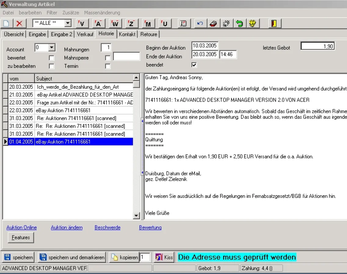 Dem Auktionator gelingt es mühelos, die gesamte Korrespondenz rund um eine Auktion zu überwachen. Das ist ein großer Vorteil für den Verkäufer, meint Detlef Zieleznik: „Er kann jederzeit nachvollziehen, welche Absprachen und Zusagen er in der Vergangenheit getroffen hat und wie weit ein Geschäft bereits gediehen ist.“ Die Daten des Käufers werden übrigens dank AdDeal direkt aus der Datenbank von eBay in das Programm übernommen. Der e-Mail-Verkehr mit eBay kann demnach vollständig entfallen. Auch sonst geht der Auktionator völlig selbstständig vor. Per Mausklick versieht das Programm einen vorbereiteten Text mit den Daten zur aktuellen Auktion, ergänzt ihn um die Bankdaten des Verkäufers und schickt ihn per e-Mail auf die Reise zum Käufer.