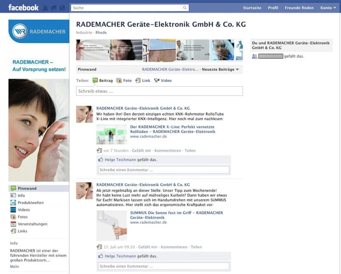 Rhede/Westfalen im Juli 2011 – Seit wenigen Tagen ist der Hausautomationsspezialist Rademacher Geräte-Elektronik auf der Social Media Plattform Facebook mit einer eigenen Unternehmensseite präsent. Wer arbeitet eigentlich in Rhede, wie funktioniert die Technik oder welche Termine stehen an? User lernen RADEMACHER ab sofort von der persönlichen Seite kennen. „Wir möchten über Facebook in den direkten Dialog mit all denen treten, die an unserem Unternehmen interessiert sind oder neue Ideen für uns haben“, berichtet Peggy Braband, Leiterin Marketing bei RADEMACHER. „Fragen rund um unsere Produkte oder die Montage wollen wir so noch schneller beantworten. Kommentare und Postings auf unserer Seite sind also stets erwünscht.“