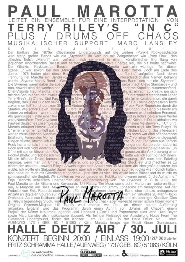 Als grandioses Finale einer 6-wöchigen Ausstellung im Kunstraum Ampersand in Köln's belgischem Viertel wird "Notes From The Cleveland Underground" die Finissage auf der "Schäl Sick" Köln's, in Deutz abhalten, wo Paul ein deutsches Ensemble durch eine Live-Aufführung von Terry Riley's minimalem Meisterwerk "In C" führt.