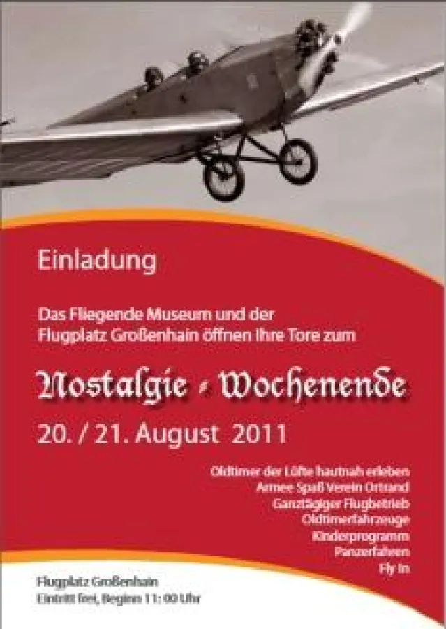 Das Nostalgie-Wochenende bietet allen eine gute Gelegenheit, den Flugplatz Großenhain, das Fliegende Museum, sowie die ortsansässigen Piloten und ihre Flugzeuge näher kennen zu lernen. Unterhaltungsmusik sowie eine Kinderschmink/Bastelstraße bietet etwas für die ganze Familie.