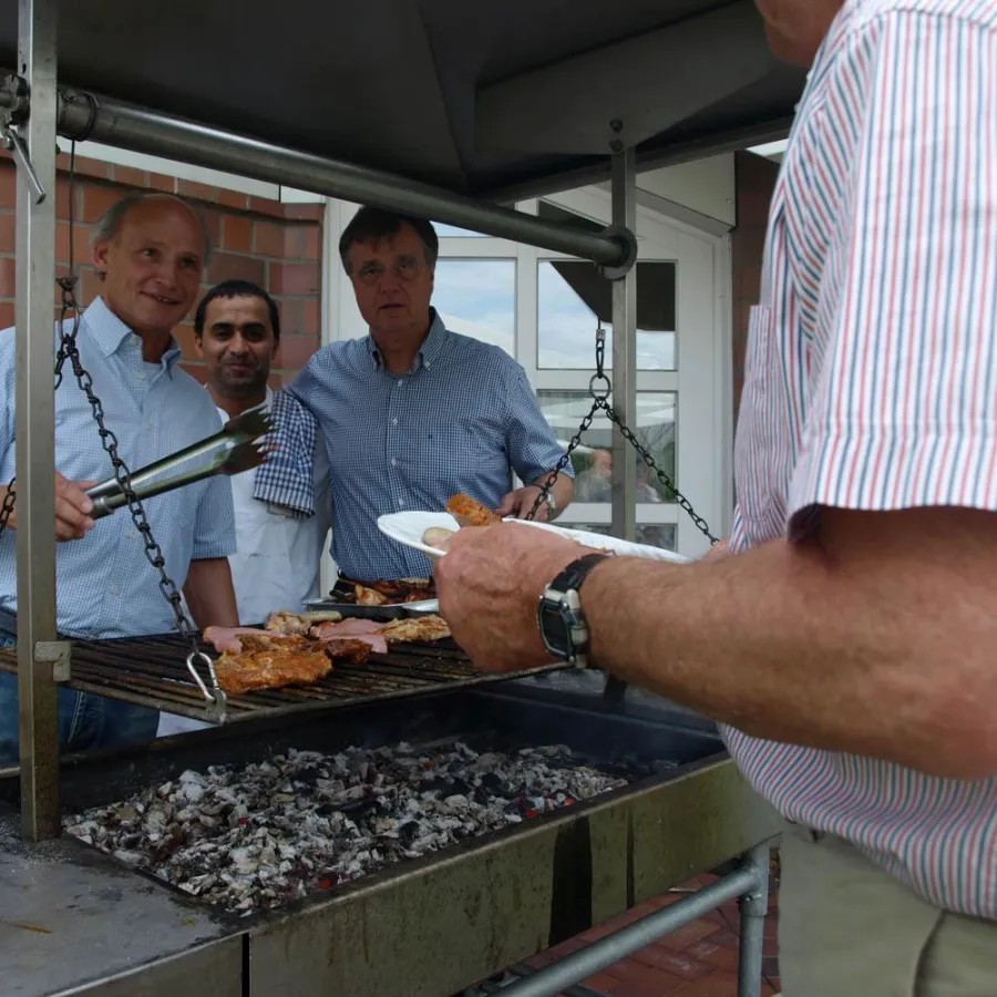 Die Vorstände der Volksbank Mönchengladbach, Otmar Tibes und Lothar Erbers (v.l.n.r.) kamen gehörig ins Schwitzen. Und das hatte mal nichts mit Turbulenzen am Finanzmarkt zu tun. Im Gegenteil: sie hatten rund 40 ehemaligen Mitarbeiter der Volksbank Mönchengladbach auf die Terrasse der Verwaltungszentrale eingeladen. Die Banker-Senioren kamen zum Grillen, Klönen und Bierchen zischen. Dabei ging es nach Informationen aus gewöhnlich gut unterrichteten Kreisen locker und hoch her. Denn das Grillfest war ein gelungenes Familienfest im besten Sinn. „Ich freue mich jedes Mal über den Zuspruch“, freut sich Vorstandsvorsitzender Lothar Erbers, „denn das zeigt uns, dass unser Betriebsklima auch über das Berufsleben hinaus intakt ist.“ Sprach´s und legte ein frisches Würstchen auf den Grill.
