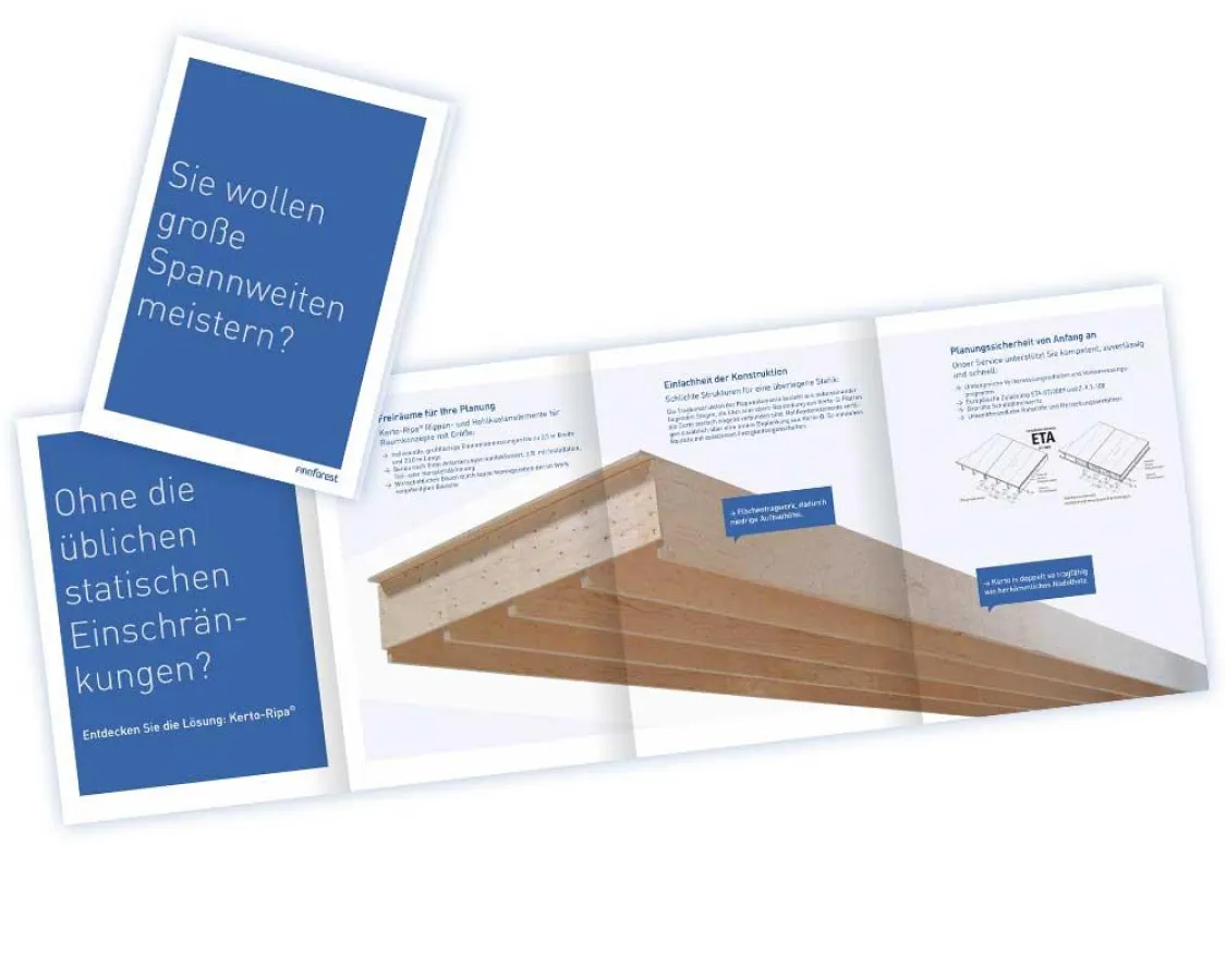 Bauen mit viel Freiraum bei der Planung großzügiger Räume, ohne Stützen und Unterzüge, wird durch das Holzbausystem Kerto-Ripa von Finnforest Merk problemlos möglich. Pantos stellt deshalb in der Direktmail-Aktion den wichtigsten Produktvorteil der Elemente plastisch und aufmerksamkeitsstark in den Mittelpunkt: großflächige Bauelemente mit bis zu 23 Metern Länge. Die Empfänger des Mailings – Bauplaner und Architekten – erleben bereits mit dem Öffnen des Kuverts die Dimension der Bauteile. Beim Ausklappen des Faltprospekts zeigt sich das Bauteil in eindrucksvoller Länge, „ohne Worte“ erklärt das Pantos-Mailing den entscheidenden Produktvorteil.