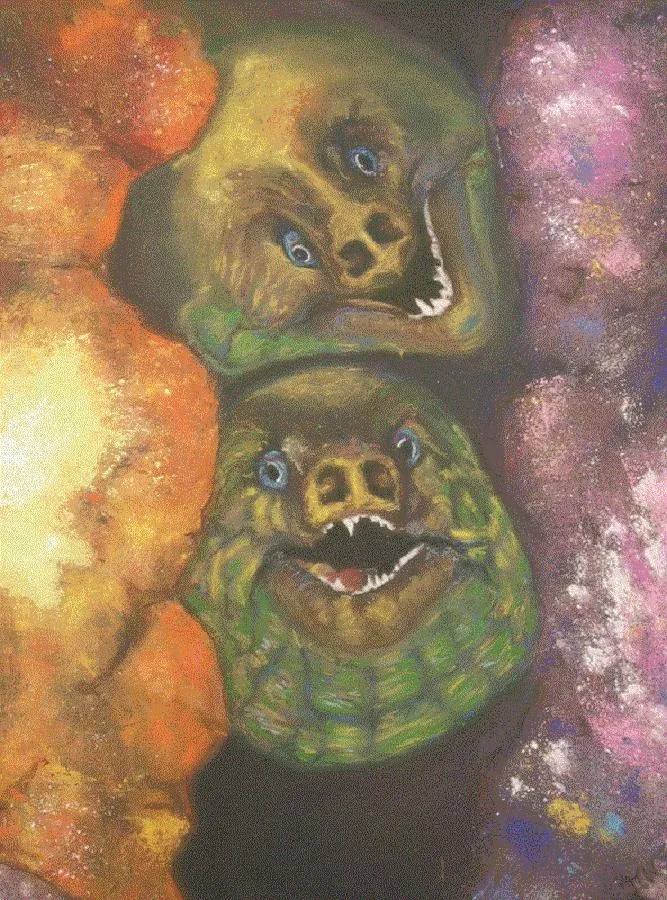 „Die Muränen, zum Beispiel“, so die Künstlerin Daniela Wernecke, „neugierig und schaulustig scheinen sie aus den Korallen hervorzukriechen, um das kopulierende Löwenpärchen zu bestaunen.“