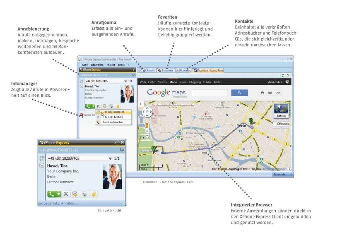 Die Neuentwicklung XPhone Express 2011 löst die Vorgängerversion XPhone CTI Standard ab. Sie beinhaltet umfassende Telefoniefunktionen, mit der das Bürotelefon über eine zentrale Benutzeroberfläche gesteuert werden kann und ermöglicht eine leichte und intuitive Bedienung. Auch der Einsatz mit schnurlosen oder schnurgebundenen Headsets für Bürotelefone ist möglich. Neben den Basis-Telefoniefunktionen unterstützt XPhone Express 2011 auch Komfortmerkmale wie Rückfrage, Makeln, Weiterverbinden von Anrufen, Konferenzschaltungen oder das Setzen der Anrufumleitung mit nur einem Klick. Anrufer werden schon beim Klingeln des Telefons identifiziert. Ein Anruf-Popup liefert bereits vor Gesprächsbeginn alle relevanten Informationen zum Anrufer und zeigt sogar ein Foto zum Kontakt an. Anrufjournale geben einen Überblick zu allen Telefonaten und unterstützen bei der Planung von Anruflisten. Häufig genutzte Kontakte lassen sich unter Favoriten speichern und beliebig gruppieren.