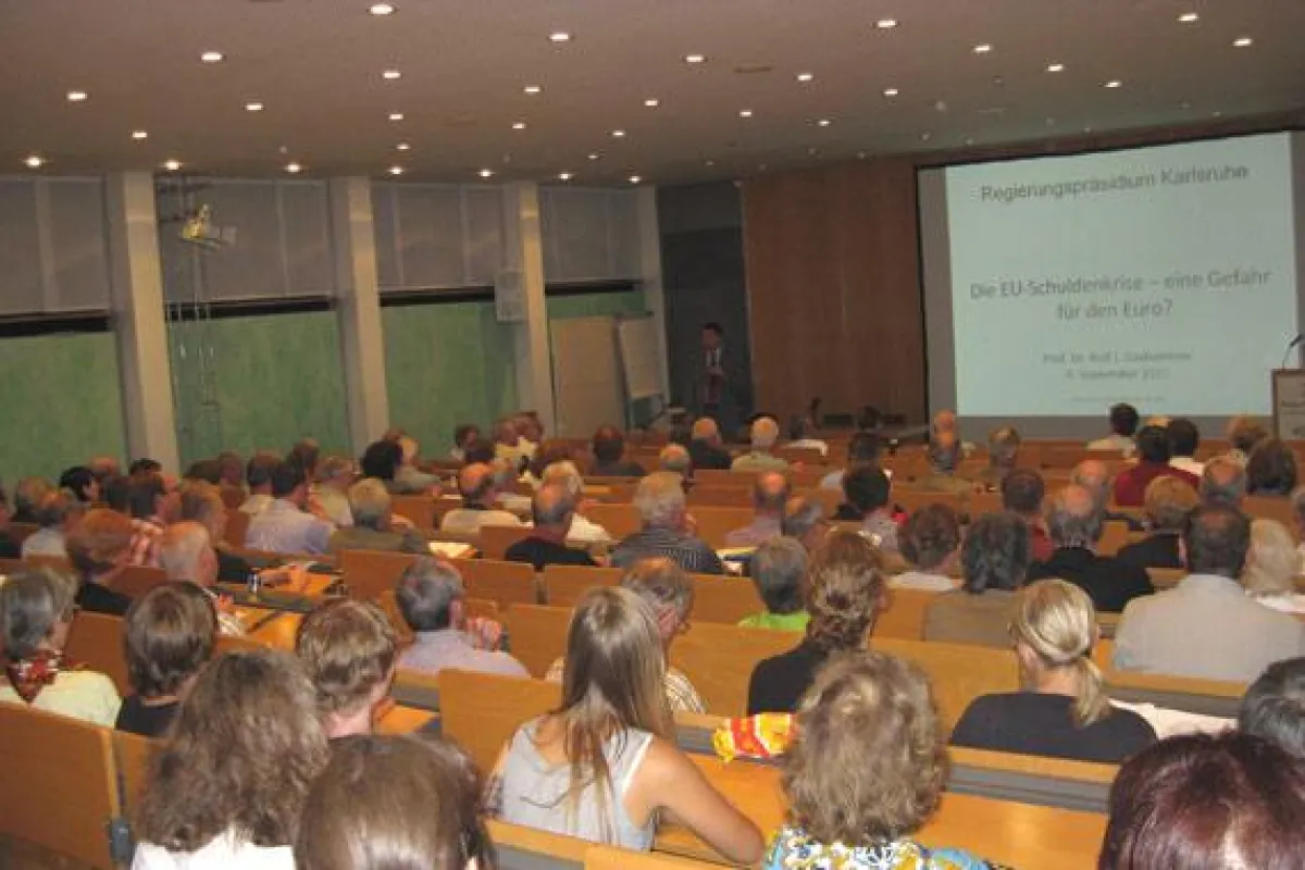 (openPR) Vor mehr als 200 interessierten Zuhörern referierte Professor Dr. Rolf J. Daxhammer am 6. September 2011 im Regierungspräsidium Karlsruhe zu dem aktuellen Thema EU-Schuldenkrise.