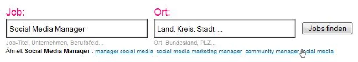 Natürlich werden dank Semantik-Funktion automatisch auch Synonyme und verwandte Suchanfragen in die Ergebnislisten der Jobsuchmaschine aufgenommen. Nun kann es aber passieren, dass es soviele exakt passende Jobtitel gibt, dass die Normalisations-Funktion überhand gewinnt. Die Normalisations-Funktion sorgt dafür, dass zuerst die Stellenangebote angezeigt werden, die exakt die Stichwörter der Suchanfrage in exakt dieser Reihenfolge im Titel bzw. irgendwo im Text beinhalten. Was ja auch Sinn macht. Synonyme werden dann aber vielleicht erst auf Seite zehn angezeigt, wo sich mitunter aber auch sehr interessante Posten bei sehr interessanten Unternehmen verstecken können. Wer keine Lust hat bis Seite zehn der Ergebnisliste zu blättern, sollte zuerst im allgemeineren Rahmen suchen, also nach "Social Media", sich dann von den ersten Ergebnissen inspirieren lassen und die Suche dann im nächsten Schritt um zusätzliche Stichwörter ergänzen.