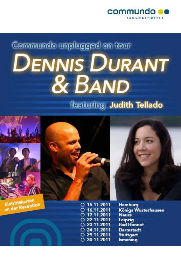 Begleitet von einer fünfköpfigen Backup Band interpretieren Sängerin Judith Tellado und Entertainer Dennis Durant ausgewählte Pop, Soul und Jazz Songs. Dabei steht neben der Musik auch der Charme und die Art und Weise des Vortrags im Vordergrund. Die Musiker freuen sich auf die Herausforderung, die technisch orientierten Tagungshotels in einen Konzertsaal zu verwandeln.