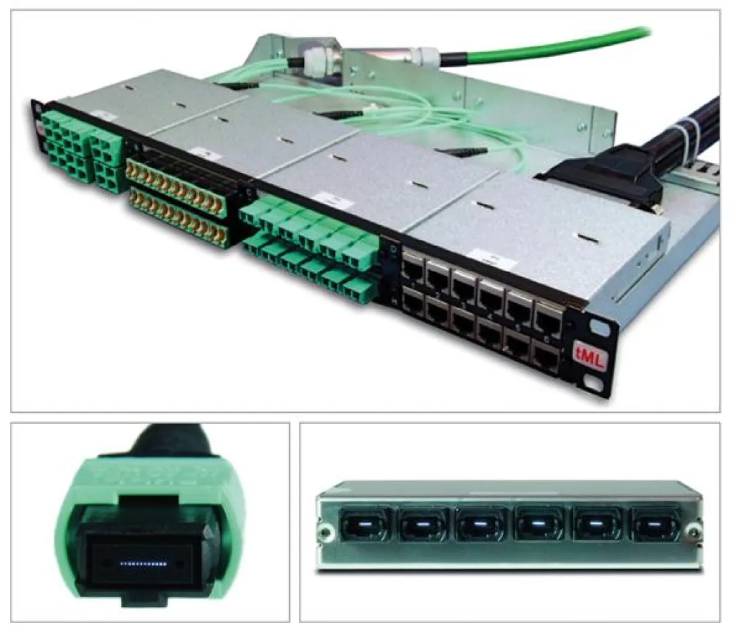 tML® ist ein patentiertes modular aufgebautes Verkabelungssystem, das aus den drei Kernkomponenten Modul, Trunkkabel und Modulträger besteht. Es handelt sich dabei um zu 100 Prozent in Deutschland gefertigte, vorkonfektionierte und getestete Systemkomponenten, die vor Ort - insbesondere in Rechenzentren - eine Plug & Play-Installation innerhalb kürzester Zeit ermöglichen. Das Herz des Systems sind die rückseitigen MPO und Telco Steckverbinder, über die mindestens 6 Ports mit 1/10GbE GbE Performance auf einmal verbunden werden können. Es gibt LWL und TP Module, die zusammen in einem Modulträger mit sehr hoher Portdichte gemischt eingesetzt werden können.