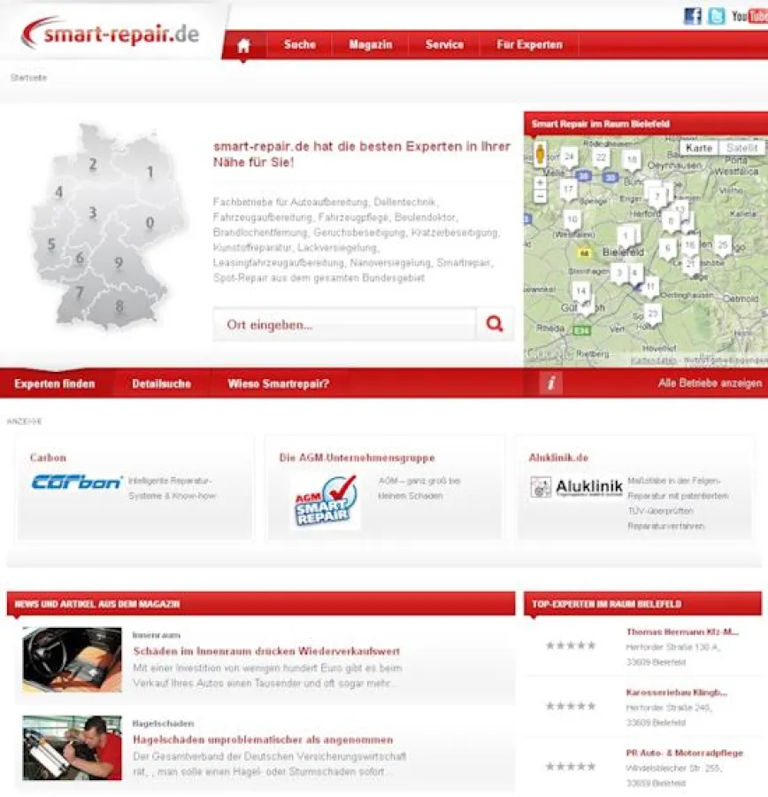 Das geht einfacher als gedacht und ist nur ein paar Mausklicks entfernt. Denn das spezialisierte Fach-Internetportal smart-repair.de listet bundesweit fast 3.000 Betriebe für Smart-Repair und Fahrzeugaufbereitung. Über einfach zu bedienende aber ausgefeilte Suchfunktionen finden Sie eine Auswahl von Betrieben, deren Leistungsprofile Sie sich in Ruhe anschauen können, die Sie vergleichen können und von denen Sie sich ein Angebot machen lassen können.