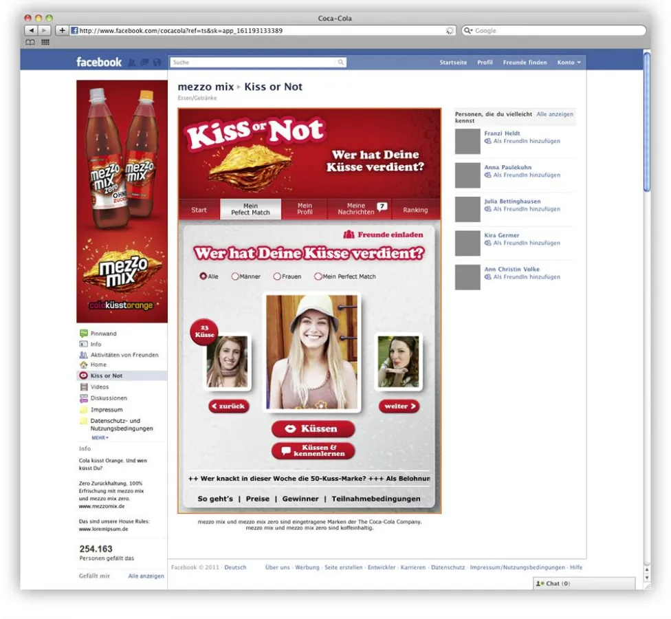 Berlin, 18. November 2011 – Die Digital- und Dialogagentur argonauten G2 launcht eine App namens „Kiss or Not“ für das Cola-Mixgetränk mezzo mix, welche die integrierte Kampagne für mezzo mix mit dem bekannten Claim „Cola küsst Orange“ begleitet. Die App soll Facebook-Nutzer animieren, andere User digital zu küssen und sie kennenzulernen.