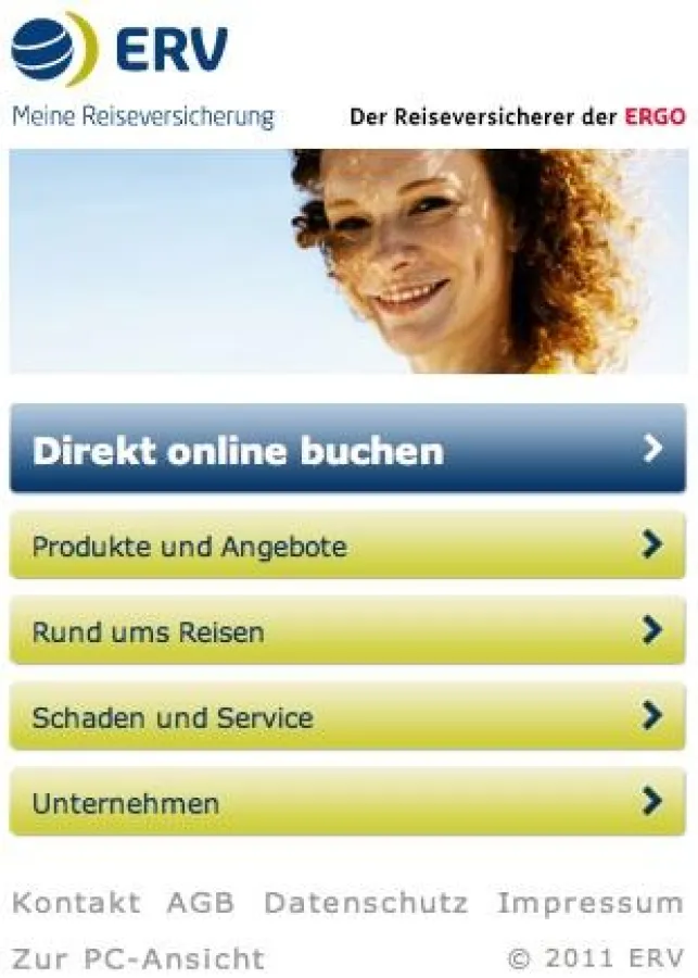 Die ERV, der Reiseversicherer der ERGO, hat ihre im Juni 2011 gelaunchte mobile Website optimiert und erweitert. Ab sofort stehen Benutzern mobiler Endgeräte unter mobil.erv.de noch mehr Services zur Verfügung. Design und Inhalte des neuen Auftritts sind optimal auf die Bedürfnisse der Smartphone- und Tablet-User abgestimmt. Steuert man die Website von einem mobilen Endgerät an, werden die Seiten automatisch im jeweils passenden Format angezeigt. So können auch auf kleinen Bildschirmen sämtliche Funktionen komfortabel genutzt werden.