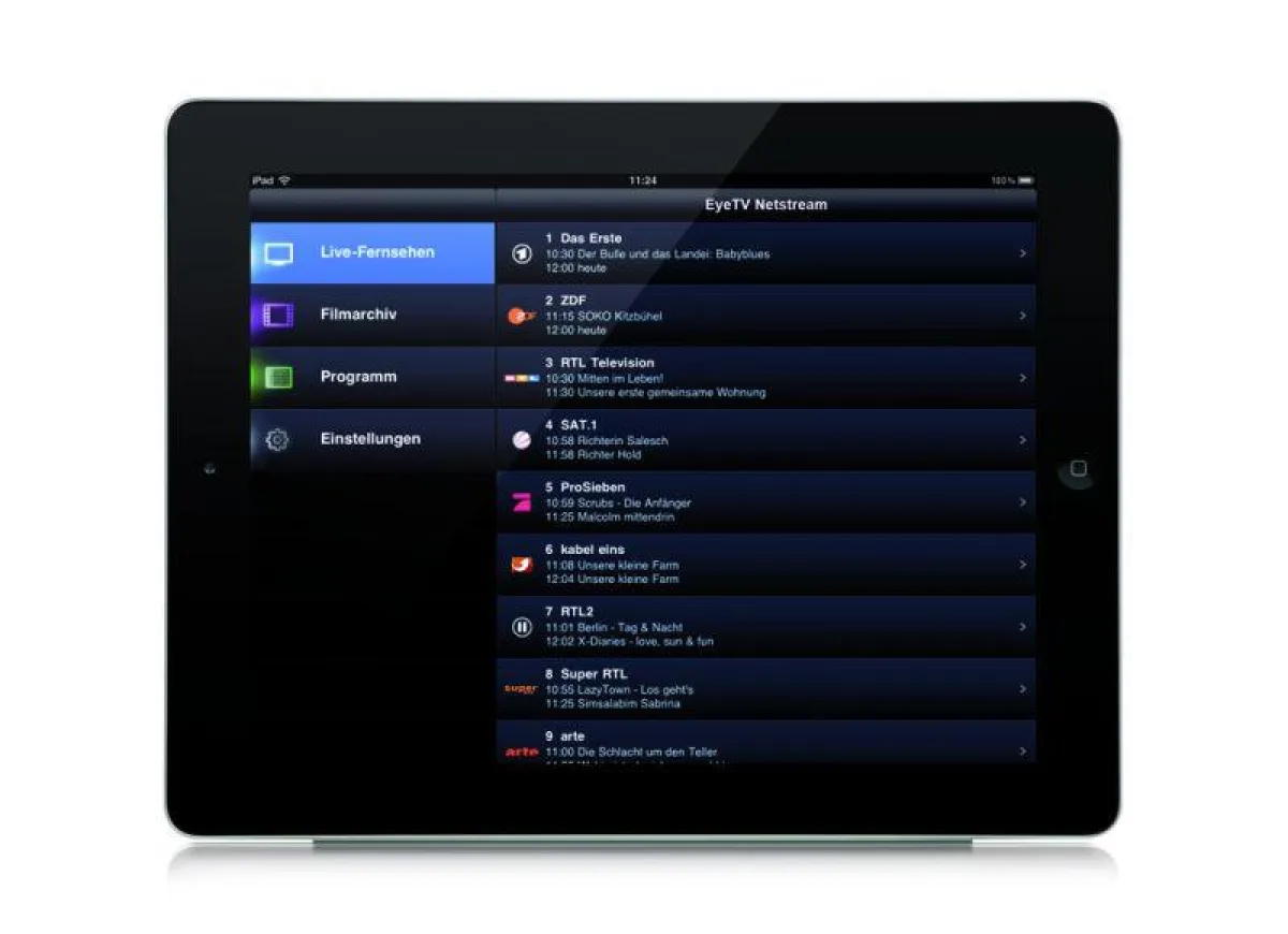 In der komfortablen Übersicht stellt EyeTV Netstream auf iOS-Geräten das TV-Programm der nächsten sieben Tage dar. Per Klappmenü und Schnellnavigation für beliebte Sendezeiten und die folgenden drei Tage findet der Benutzer schnell die Highlights im Programm, Farbkodierungen für die einzelnen Genres helfen bei der Suche. Per Fingertipp gibt es jeweils zusätzliche Informationen zur ausgewählten Sendung. Die Beschreibungen der TV-Highlights lassen sich über E-Mail oder Twitter mit Freunden teilen und alternativ auf einem AirPrint-fähigen Drucker ausgeben. Die Programmübersicht bezieht ihre Informationen aus dem DVB-Datenstrom, Menge und Aufbereitung können je nach Sender variieren.