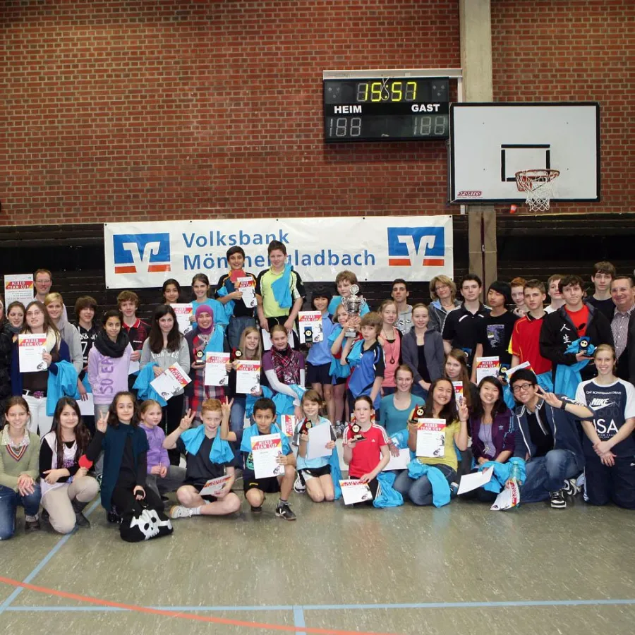 Möglich wurde das Turnier durch die Volksbank Mönchengladbach. Nicht nur, „dass jedes Kind ein Erinnerungsstück mitnehmen konnte, z.B. entweder in Form eines Mini-Schlägers oder ab Platz 4 in Form eines T-Shirt und einer Urkunde.“ Der Jubel beim Franz-Meyers-Gymnasium sei riesengroß gewesen, „als ihr Name aus der Lostrommel gezogen wurde. Die hochwertige Tischtennisplatte, gespendet von der Volksbank, wird sicher sofort Nutzer an der Schule finden!“