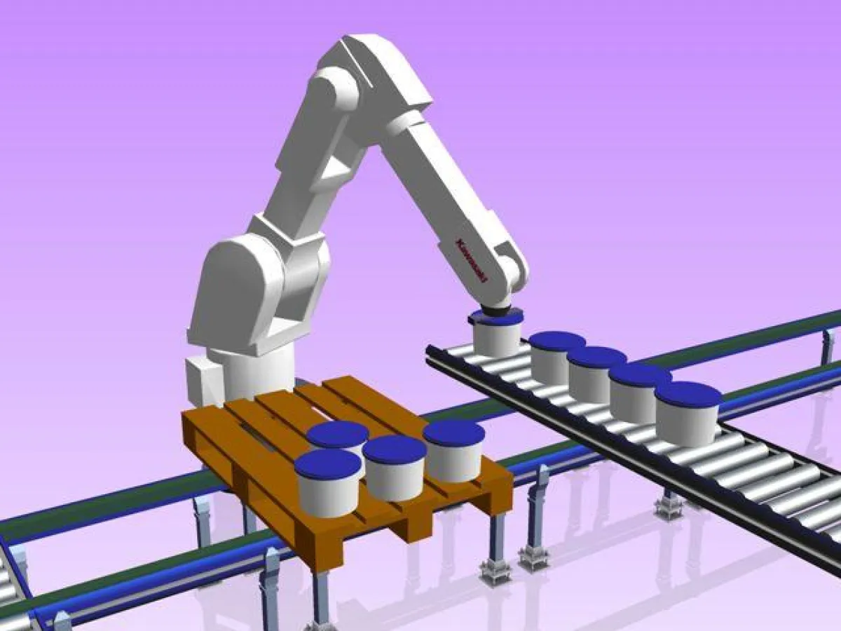 In der präsentierten Roboterzelle greift ein Roboter (Kawasaki RD 080 N) Eimer von einer Fördertechnik des de Man Partners KNAPP Moving und palettiert sie auf eine bereit gestellte Palette. Die Eimer werden dabei einzeln gegriffen und so abgesetzt, dass eine einheitliche Orientierung entsteht. Mit dem eingesetzten Greifersystem können unterschiedliche Eimergrößen ohne Greiferwechsel palettiert werden, was zu einer deutlichen Zeit- und damit Kostenersparnis beiträgt. Diese auf der AnugaFoodTec gezeigte Lösung ist Teil einer Palettieranlage für Eimer, die de Man derzeit für einen Kunden entwickelt und realisiert. Im Gegensatz zur räumlich begrenzten Messezelle arbeitet de Man bei diesem Projekt allerdings mit zwei Robotern, die gleichzeitig eine Palette palettieren, was zu einer deutlich erhöhten Taktleistung führt. Zudem ist hier für das Greifen von Bodenlagen und H1-Paletten ein separates Werkzeug vorhanden, das von dem Roboter nur bei Bedarf aufgenommen wird. Auf diese Weise kann das Werkzeug optimal auf seinen Zweck ausgelegt werden und schränkt den Roboter beim Palettieren nicht ein.
