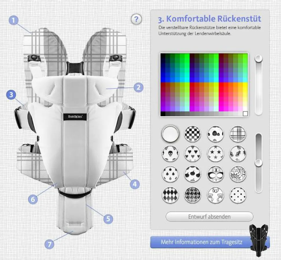 Bei der Gestaltung des eigenen Wunsch Tragesitzes sind beinahe keine Grenzen gesetzt. Mit der Facebook Applikation kann jetzt jeder zum Produktdesigner werden, die verfügbaren Farben und Muster lassen keine Wünsche offen – die Kombinationsmöglichkeiten sind grenzenlos. Einfärben und Muster anbringen geht mit simpler Auswahl und Klick kinderleicht und kann so auch zum digitalen Malerlebnis für die ganze Familie werden. Abgesendete Entwürfe nehmen automatisch am Wettbewerb teil und können mit Freunden geteilt, kommentiert und bewertet werden.