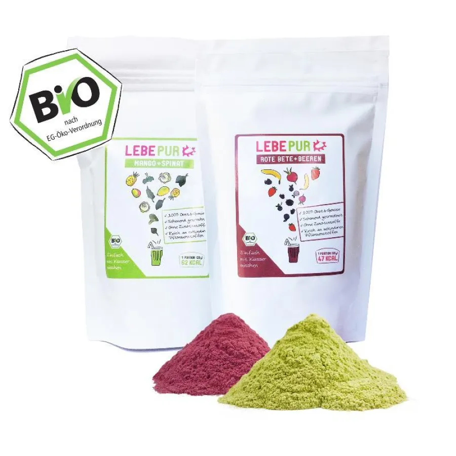 Lebepur wird aus frischem, qualitativ hochwertigem Obst und Gemüse herstellt. Um die natürliche Reinheit des Produkts zu gewährleisten und eine Belastung durch Pestizide und andere Schadstoffe auszuschließen, wird jeder einzelne Produktionsschritt genau kontrolliert. Für die Herstellung des Pulvers werden ausschließlich erntefrische und vollreife Früchte mit dem höchsten Anteil an wertvollen sekundären Pflanzenstoffen (Antioxidantien) und Vitaminen schonend gefriergetrocknet. Die schonende Produktion garantiert, dass die wertvollen Inhaltsstoffe auch in Pulverform nicht verloren gehen. Da bei Lebepur auf die Zugabe von Zusatzstoffen verzichtet wird, sind die Smoothies kalorienarm und ballaststoffreich und eignen sich auch für eine vegane Ernährung. Eine Tüte Lebepur kostet 9,90 Euro und reicht für circa 10 Smoothies, das heißt ein Smoothie kostet gerade mal 1 Euro.