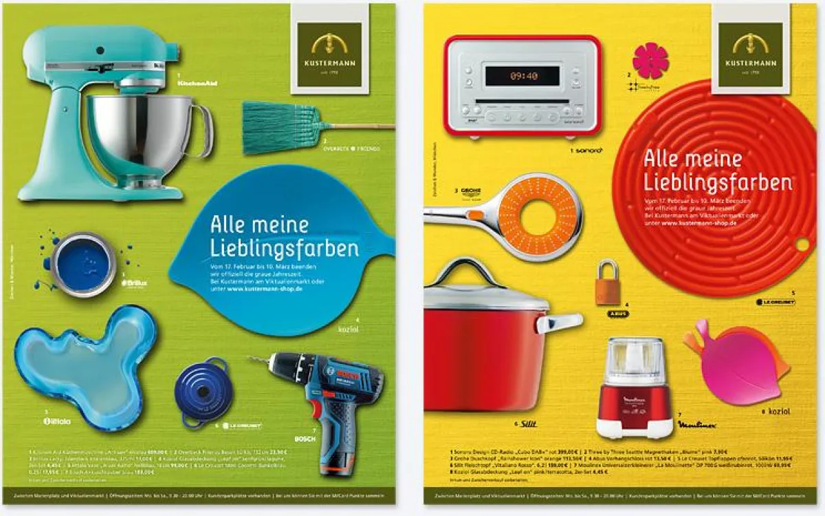 Die Print-Motive im A4-Format zeigen ausgewählte Produkte aus dem Hause Kustermann und sollen den Kunden auf das breite Produktsortiment aufmerksam machen und inspirieren, immer wieder neue Welten im Haus zu entdecken. Die zwölf Anzeigenstaffeln stehen jeden Monat unter einem anderen Motto. So soll die aktuelle Staffel, die am 17. Februar im SZ Magazin startet, ein Signal gegen die graue Winterzeit setzen. Unter dem Motto "Alle meine Lieblingsfarben" besticht diese Reihe durch ihre inspirierende Produktauswahl und die kraftvollen Farbkontraste.