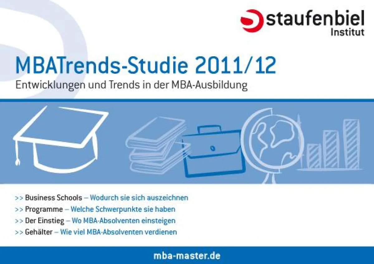 Für die Studie Staufenbiel MBATrends 2011/12 wurden bereits zum 19. Mal die weltweit führenden Business Schools nach aktuellen Daten und Trends in der MBA-Ausbildung befragt. Die Studie liefert detaillierte Informationen über die Schulen und ihre Programme, über Schwerpunkte, Internationalität und die Teilnehmer. Die Staufenbiel MBATrends-Studie 2011/12 befragte die Schulen außerdem nach den Einstiegsbranchen und Einstiegsfeldern ihrer Absolventen und danach, was diese nach dem MBA verdienen.