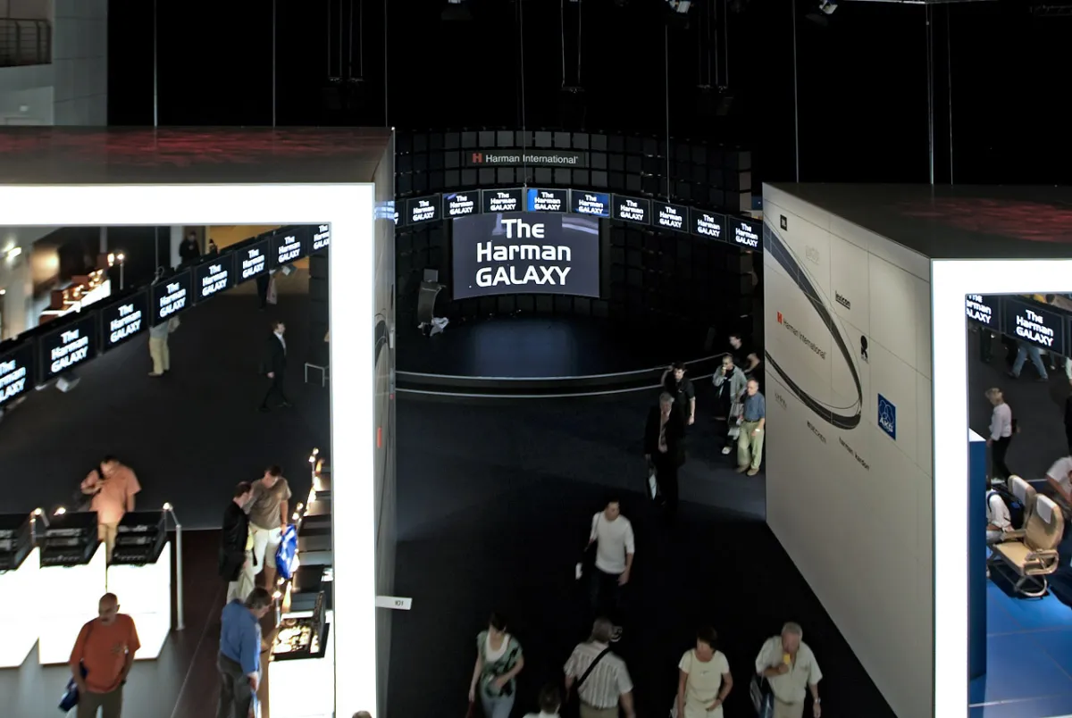 Berauschende Erlebniswelten für Infotainment par excellence schuf das ict Team in Zusammenarbeit mit der leading Agentur WengerWittmann GmbH, München-Haar, auf dem Stand von Harman International: Der Weltmarktführer im professionellen Audiobereich präsentierte seine Konzernmarken auf über 4.000 qm als Gesamtauftritt in der „Harman Galaxy“. Mittelpunkt dieser Galaxie war eine von der Decke abgehängte, 150 m lange und 25 m breite Ellipse mit 241 aneinander gereihten Plasma Displays, die als Orbit die einzelnen Markenwelten von Harman International visuell vereinigte. Die an der ellipsenförmigen Stahlkonstruktion innen und außen montierten 42“ Plasma Bildschirme wurden mit einer in diesem Umfang noch nie dagewesenen DVD-Synchronzuspielung gespeist. Insgesamt 150 DVD-Player spielten das speziell angefertigte Filmmaterial frame-genau zu, das auf dem Orbit faszinierende Lauflichteffekte oder Brandings zur Bereichskennzeichnung darstellte. Zur Steuerung der 150 DVD-Player wurden mehrere, miteinander vernetzte ict ControlMachines CM 2 eingesetzt. Die professionellen, bewährten ict Mediensteuerungen lösten diese äußerst anspruchsvolle und komplexe Aufgabenstellung souverän. Die in der ict ControlVision Steuerungssoftware enthaltenen Möglichkeiten zur Verwaltung von DVD-Playern in Gruppen und die Features zur Synchronsteuerung ermöglichten die Programmierung des Projekts trotz des enormen Hardware-Umfangs zuverlässig und in kürzester Zeit. Dank der ausgeklügelten Steuerungsmöglichkeiten der ControlVision Software konnten sämtliche DVDs content-gleich erstellt werden, was die Produktionskosten deutlich verringerte. Selbstverständlich wurde das visuelle Erlebnis zusätzlich durch eine auditive Komponente unterstrichen, um alle Sinne der Besucher anzusprechen. Dafür wurden auf der Unterseite des Orbits über 50 JBL-Lautsprecher angebracht, die das Klangerlebnis 25-kanalig dem Bild folgen ließen. Nicht selten sah man verblüffte Besucher auf dem Stand, die sich um ihre eigene Achse drehten, um die „vorbeifliegenden“ Markenlogos verfolgen zu können. Auf der Showbühne des Harman International Messestandes hatten die neu im ict Produktportfolio aufgenommenen Steglos Plasma Displays – die Revolution auf dem Plasma Sektor – ihre Feuertaufe: Eine konkave Plasma Wand aus 4 x 4 Screens mit nur 5 mm breiten Stegen zwischen den Panels zeigte die Kamera-Live-Bilder der Showbühne im Großformat. Dank der hochauflösenden Plasma Wand konnten zudem interaktive Spiele eines täglich live vom Stand sendenden Radiosenders direkt vom PC hochaufgelöst übertragen werden. Die kaskadierbaren 42“ Steglos Plasma Displays sind zu beliebig großen, hochauflösenden Multi-Screens kombinierbar und durch ihr dünnes und schlankes Design absolut flexibel einsetzbar. Weitere medientechnische Exponate rundeten den fulminanten Messeauftritt von Harman International ab.