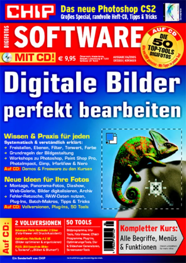 „Anspruchsvolle Foto-Amateure brauchen Photoshop CS 2“, urteilt Heico Neumeyer nach seinem Test von zehn aktuellen Bildbearbeitungsprogrammen. Grund genug, dass CHIP Software detailliert auf die Neuerungen von Photoshop CS 2 eingeht und die wichtigsten Funktionen und Operationen in der Praxis vorstellt. Damit nicht genug: Wie sich der Hauptnachteil von Photoshop – der hohe Preis von rund 1.040 Euro – mit einem Update-Trick auf etwa 350 Euro reduzieren lässt, erfährt der Leser ebenfalls. Eine ältere Version für maximal 50 Euro bei eBay kaufen und für 300 Euro bei Adobe auf CS 2 upgraden – schon sind fast 700 Euro gespart.